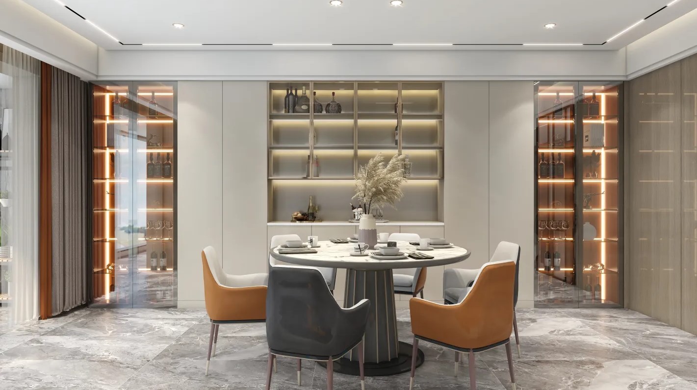 本案的空間通透明亮是輕奢設(shè)計(jì)的關(guān)鍵,開放式品酒區(qū),處處彰顯主人的生活品味,天鵝絨坐墊獨(dú)有的厚重感和光澤度成為輕奢復(fù)古的代名詞,跳躍的色彩,使空間更具質(zhì)感。