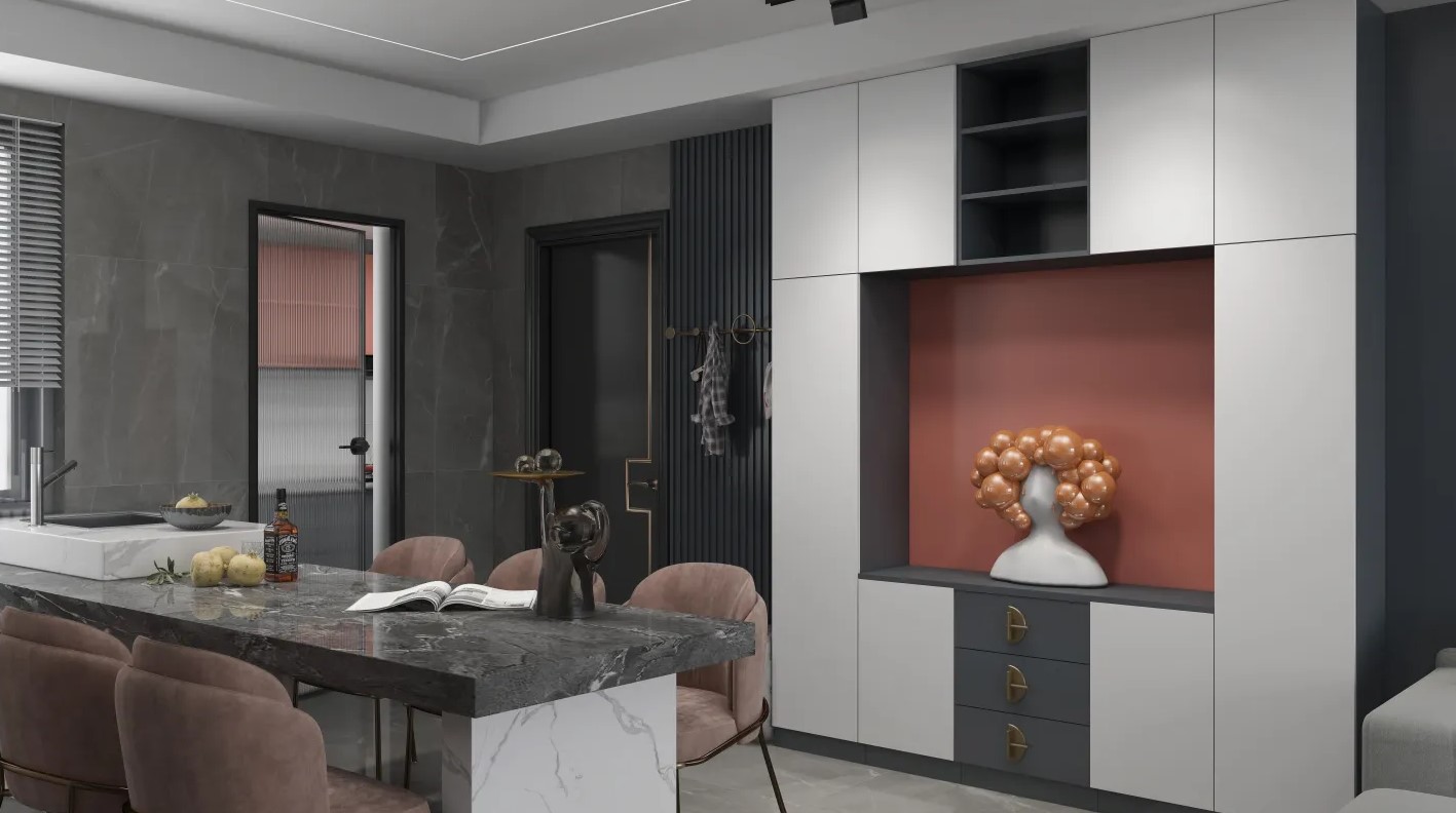 在簡約的空間里,設(shè)計師通過材質(zhì)、色彩的運用和軟裝的搭配將輕奢風(fēng)打造得淋漓盡致,本案的業(yè)主是一個從事少兒藝術(shù)教育的老師,所以在對空間藝術(shù)的追求上更加講究,在房屋中的壁畫和很多雕像等都是業(yè)主自己去批發(fā)市場挑選,設(shè)計師說和業(yè)主有很多的興趣愛好相同,對視覺感和整個房屋光線的和諧也是不謀而合,讓這個空間成為更好的一個亮點。