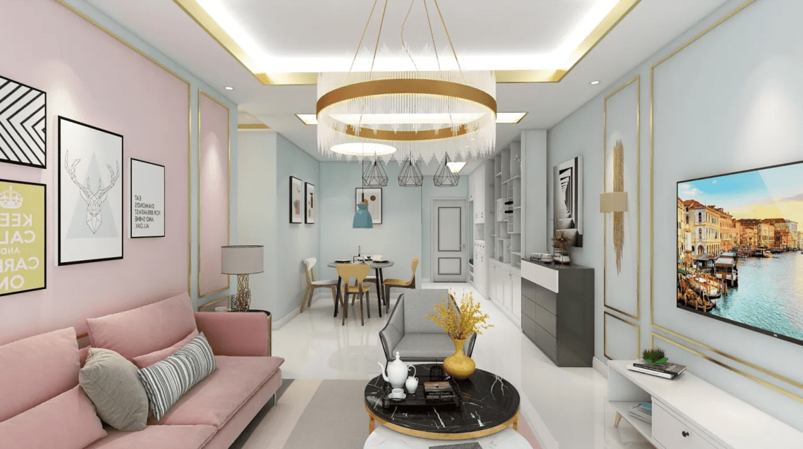 整體基本以藍色和粉色為主,現(xiàn)代風格和北歐風格來裝飾這個家的溫暖